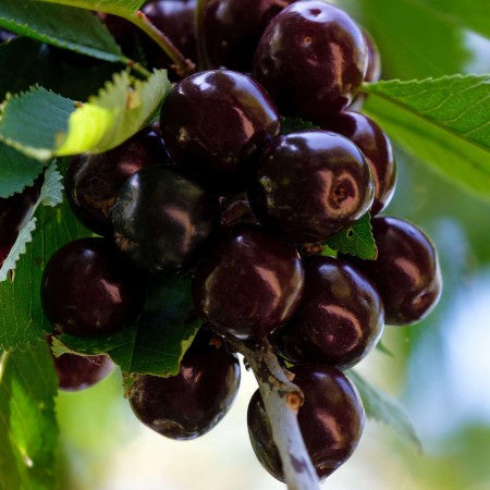 Fructele sunt mari, rotunde de culoare visiniu inchis - negru, lucioase, pulpa este de culoare rosie visinie, usor acidulata, astringenta, semiaderenta la sambure.